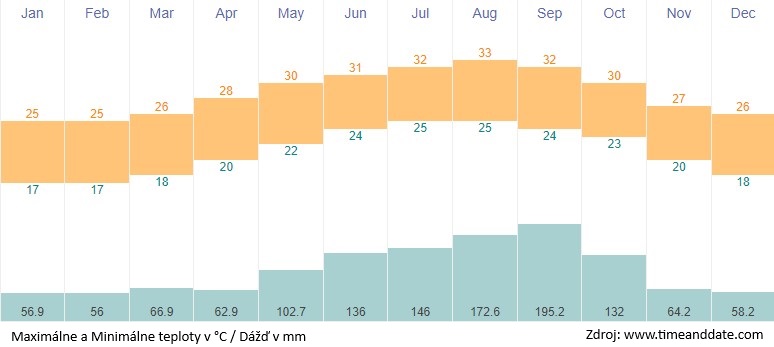 Teplota mora: od 24 °C (január - február) až po 29.8 °C (júl - august).