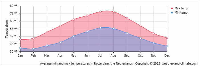 Rotterdam má mierne oceánske podnebie podobné všetkým pobrežným oblastiam v Holandsku. Nachádza sa blízko pobrežia a klíma je tu o niečo miernejšia ako vo vnútrozemí.